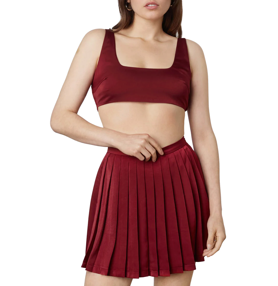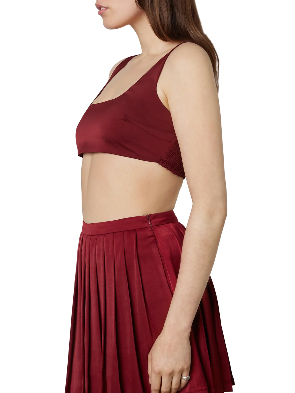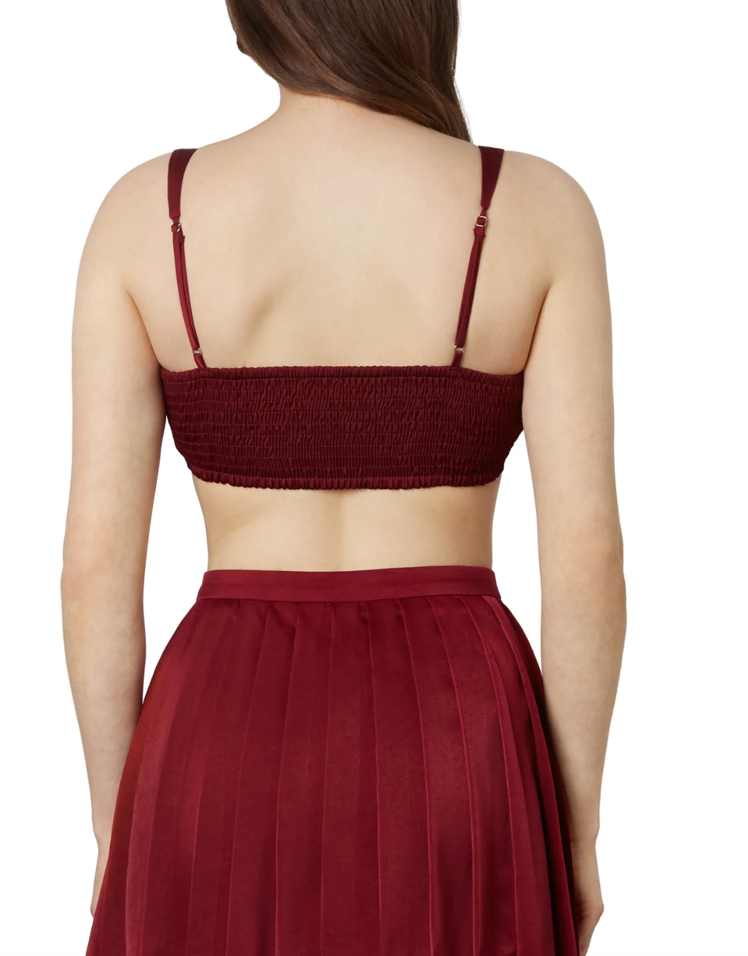 A satin, square neck bralette with adjustable straps and a smocked elastic back.